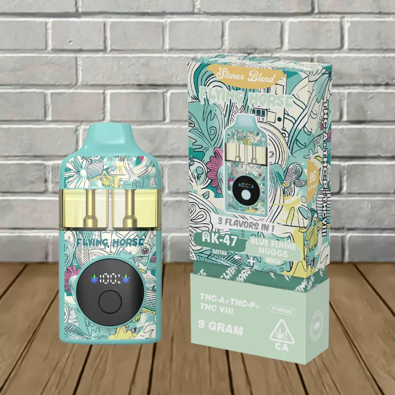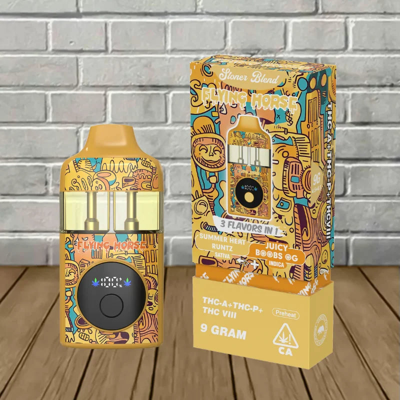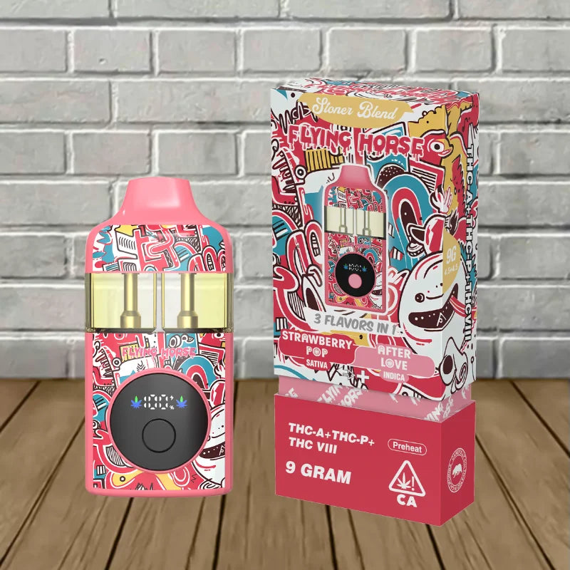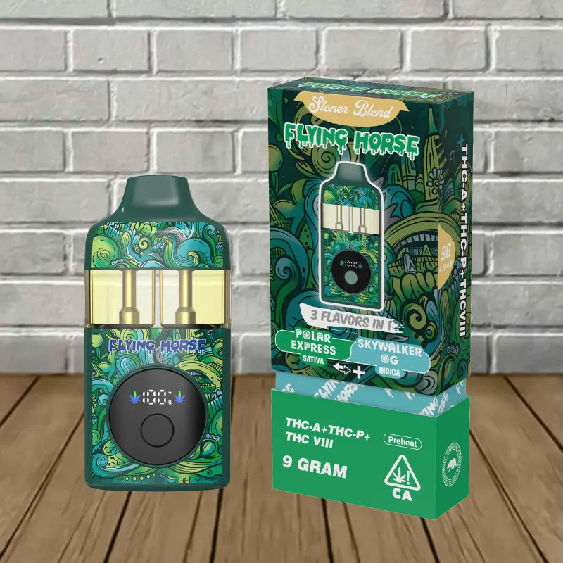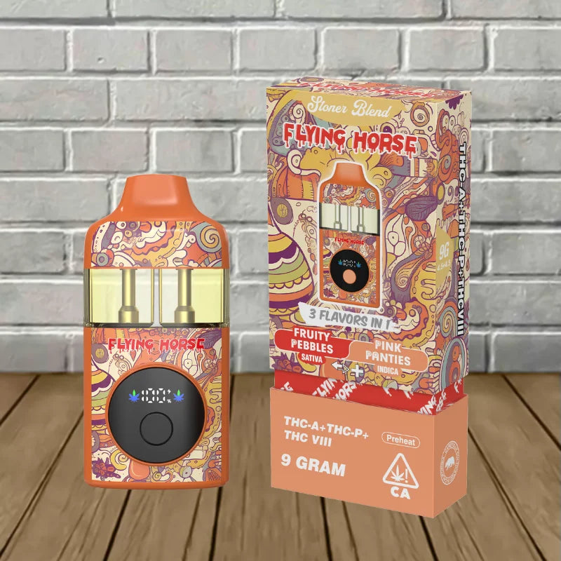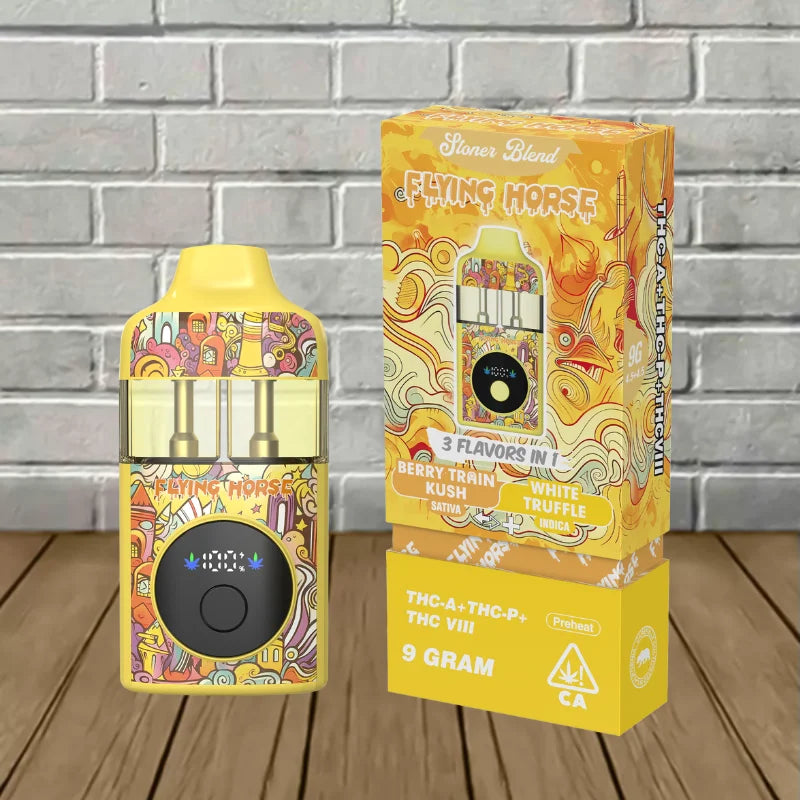 Flying Horse Stoner Blend Black Edition contains an ultra-potent 9g blend of THCa, Delta 9 THCP, Delta 8 THC, and unique flavor-packed terpenes. This device offers a sophisticated and potent vaping experience by perfectly fusing innovative technology with premium ingredients.