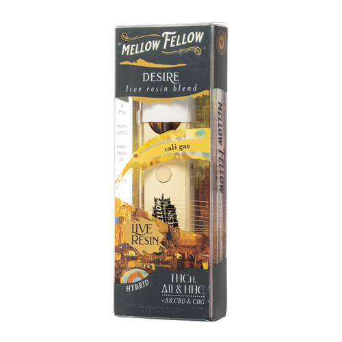 Uncover the Mellow Fellow Desire Blend Live Resin Disposable, offering 2000mg of THCh, Delta-11, HHC, Delta-8, CBD, and CBG in a preheating live resin disposable with firing button operation.