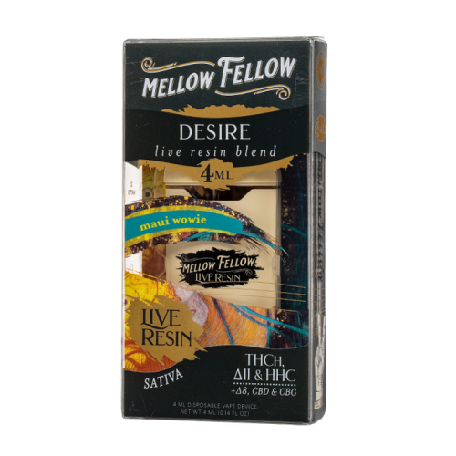 Discover Mellow Fellow Desire Blend Live Resin Disposable, offering 4 grams of delta 8, delta 11, HHC, THC-H, CBD, and CBG in a vape with preheat function.
