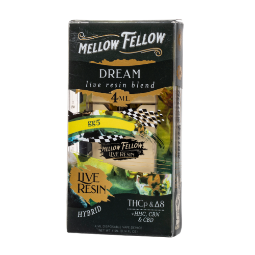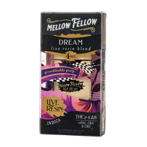Discover the Mellow Fellow Dream Blend Live Resin Disposable, offering 4 grams of live resin delta-8, HHC, THC-P, CBN, and CBD for a relaxing experience. With live resin extraction, the Mellow Fellow Dream Blend Live Resin Disposable is packed with even more flavor from hemp plants to uplift the taste buds along with the mind and body, whisking them away to a floaty dreamscape.