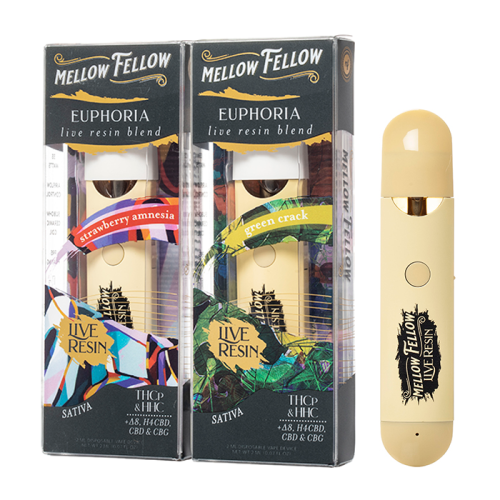 Enjoy the Mellow Fellow Euphoria Blend Live Resin Disposable, featuring 2000mg of THC-P, HHC, Delta-8, H4CBD, CBD, and CBG in a preheating live resin disposable with firing button operation.