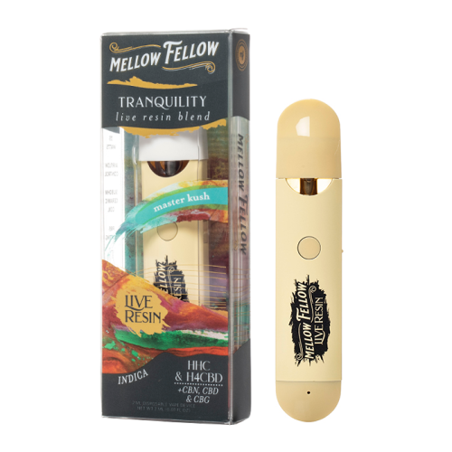 Check out the Mellow Fellow Tranquility Blend Live Resin Disposable, featuring 2000mg of HHC, H4CBD, CBN, CBD, and CBG in a preheating live resin disposable with firing button operation.