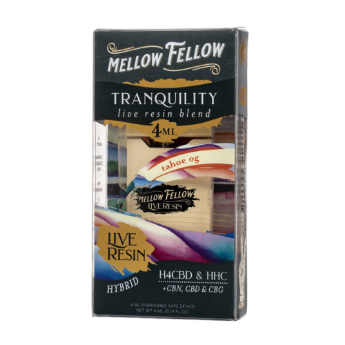 Discover Mellow Fellow Tranquility Blend Live Resin Disposable, offering a 4-gram blend of HHC, H4CBD, CBN, CBD, and CBG inside a preheating disposable.