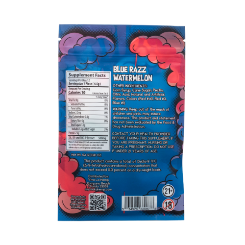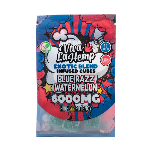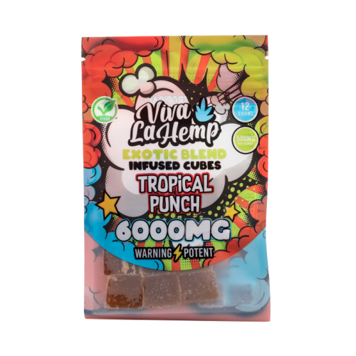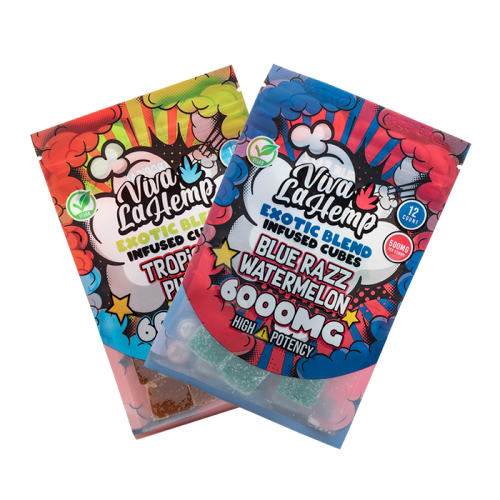 "Discover Viva La Hemp Exotic Blend Gummies, offering 500mg of delta 8, HHC, and CBN in each delicious gummy, packing 12 gummies in an entire 6000mg bag.